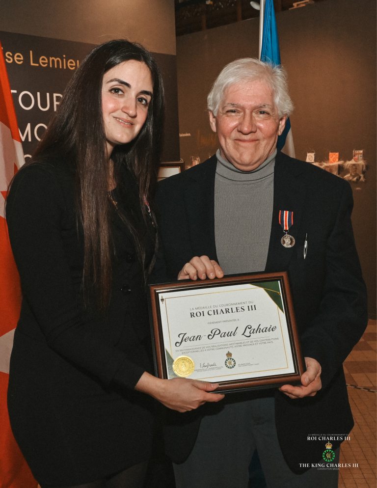 La remise de la Médaille de couronnement du roi Charles III par Mme Emmanuella Lambropoulos, députée de Saint-Laurent, à M. Jean-Paul Lahaie, Président du CA de l’AQDR/ASTL, pour ses réalisations exce