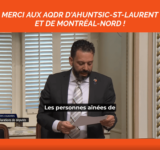 À l'Assemblée Nationale, si souligne le travail de l’AQDR et particulièrement des deux sections de la circonscription de Maurice-Richard, celle d’Ahuntsic-St-Laurent et celle et Montréal-Nord.