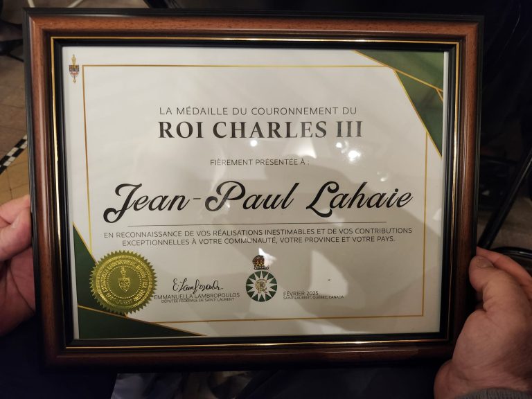 La remise de la Médaille de couronnement du roi Charles III par Mme Emmanuella Lambropoulos, députée de Saint-Laurent, à M. Jean-Paul Lahaie, Président du CA de l’AQDR/ASTL, pour ses réalisations exceptionnelles et ses contributions à la société canadienne et à sa communauté.